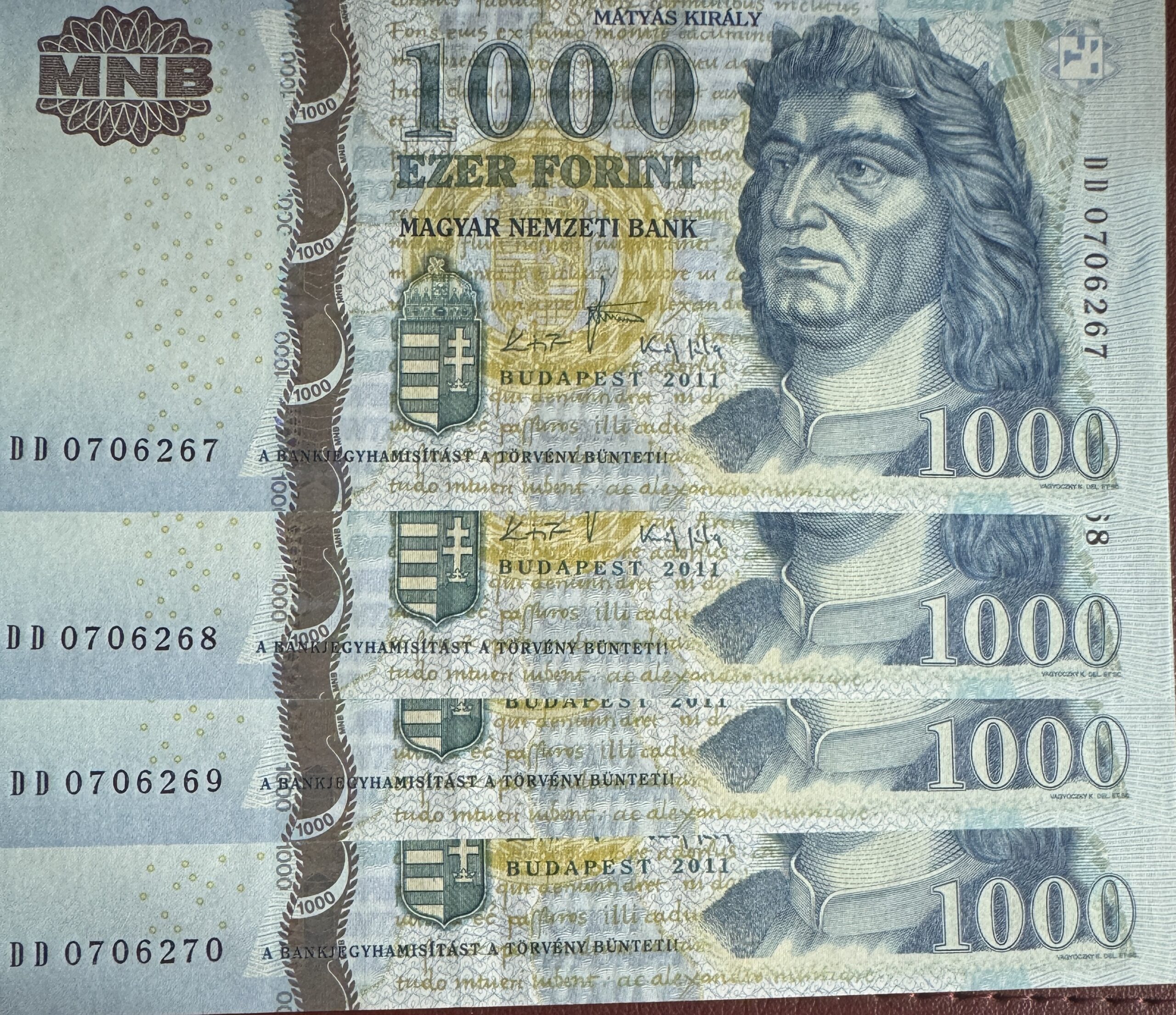 1000 forint bankjegy (DD) 4 db sorszámkövető 2011 (UNC)