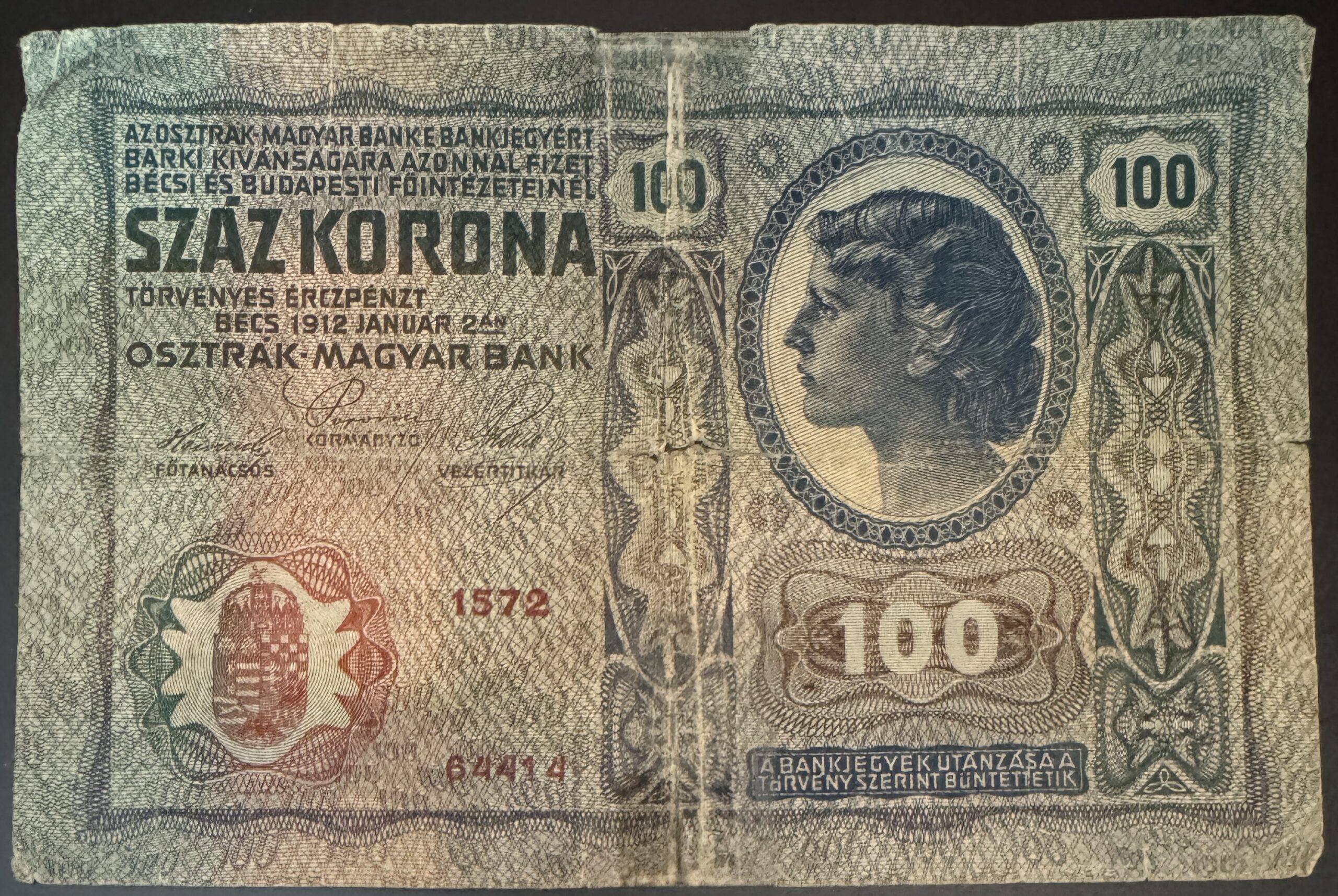 1912. 100 korona bankjegy felülnyomott (VF)