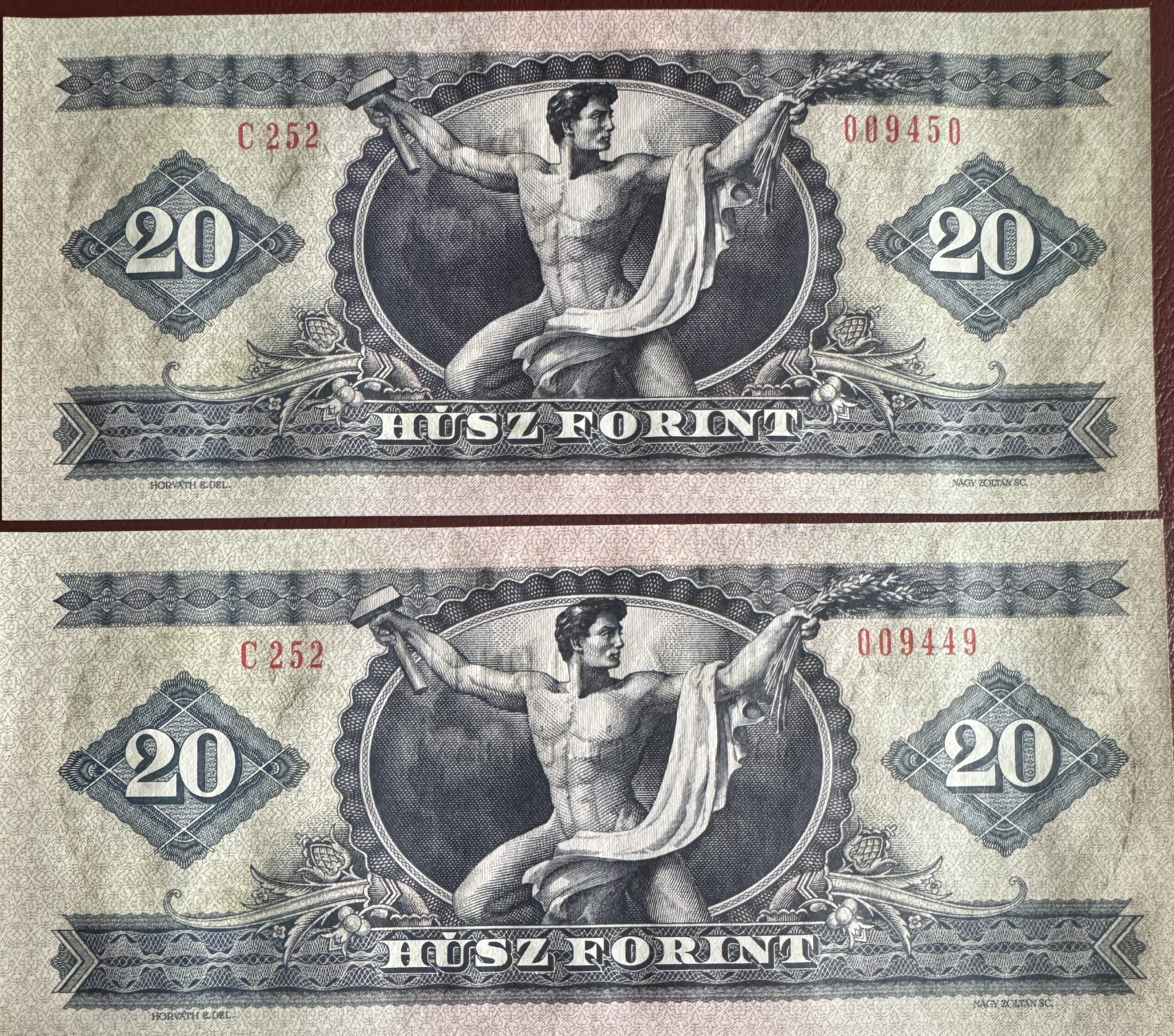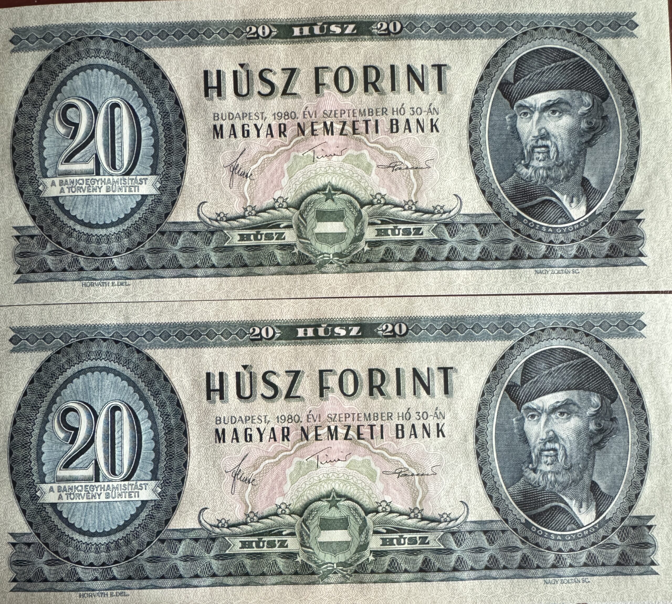 20 forint bankjegy 2 db sorszámkövető 1980 (UNC)